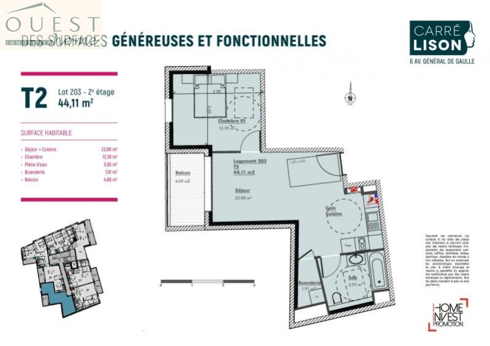 Plein centre "carré de Lison" résidence neuve de préstige, appartement de standing T2 44,11 m² comprenant 1 séjour avec cuisine US, 1 chambre + dressing, 1 salle de bain ~Charges prévisionnelles annuelles : 30 '/m²~Possibilité Box fermé en sus 25 000 '~Disponible 2eme semestre 2021