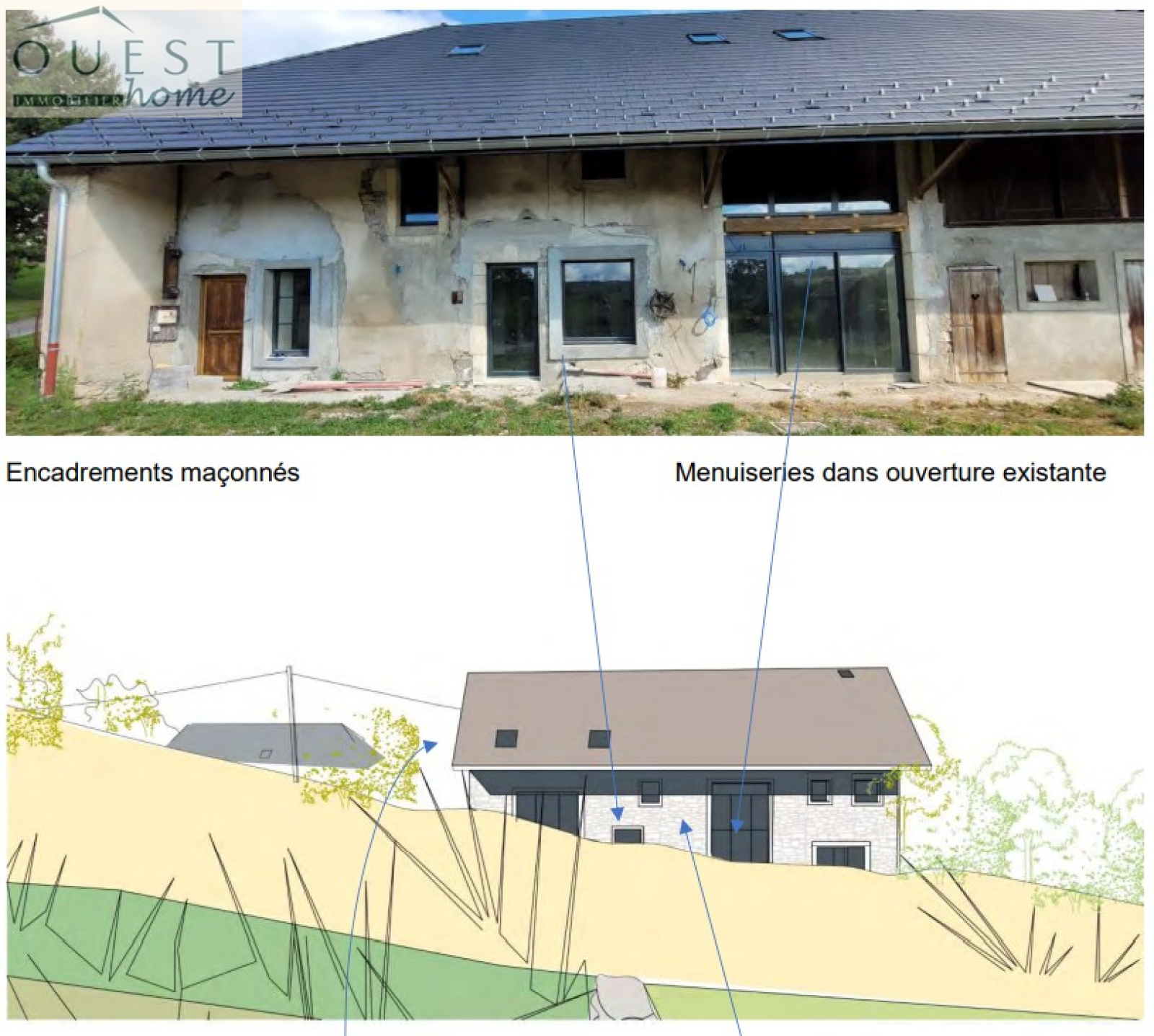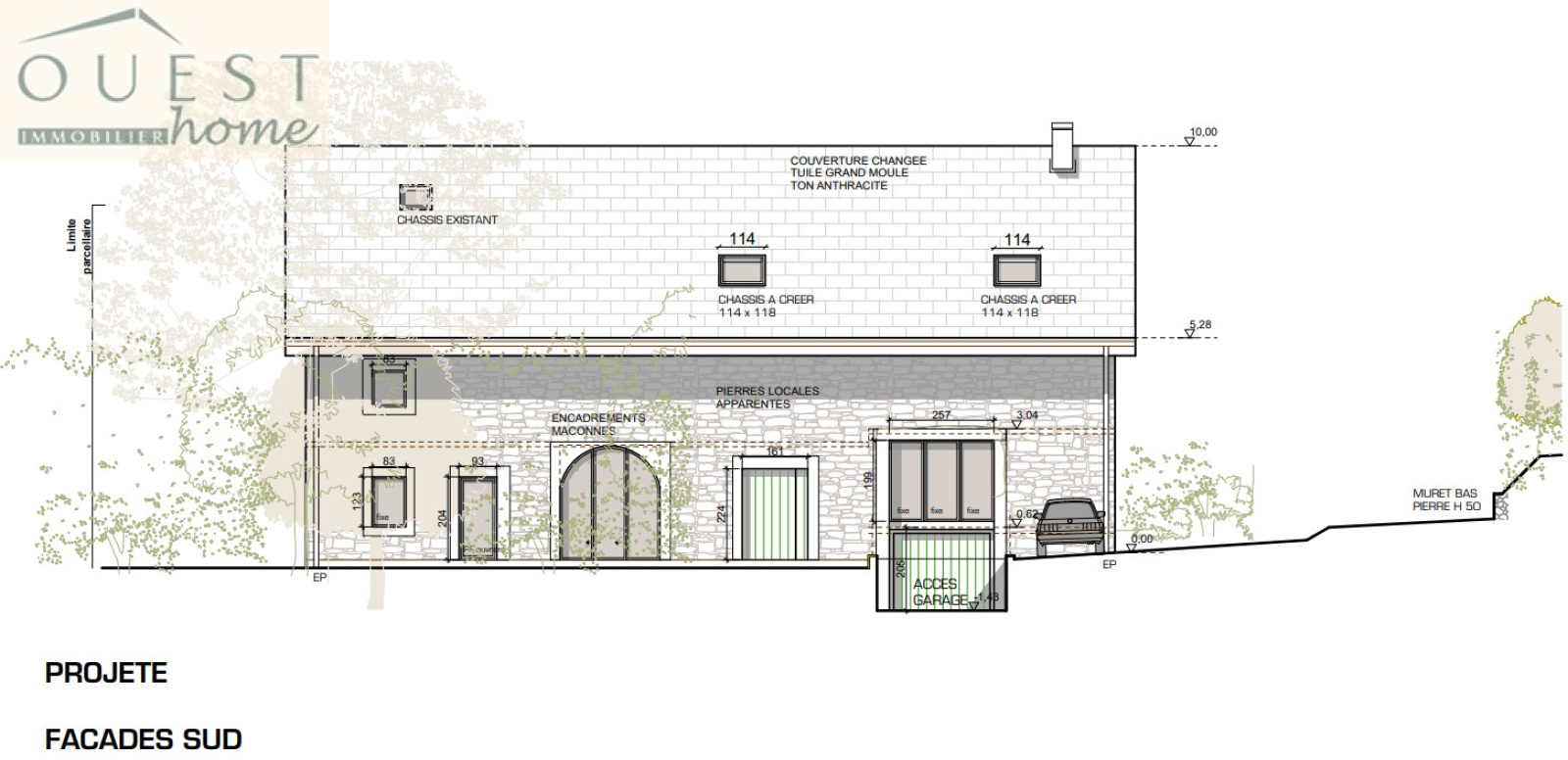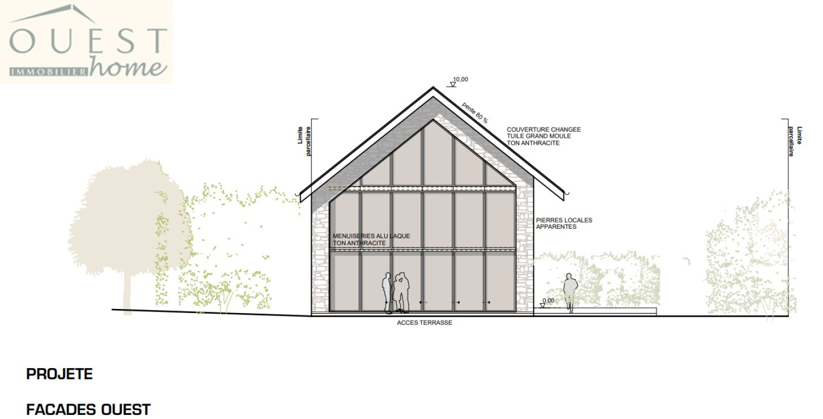 Dans le cadre du permis, l'intérieur n'est pas arrêté sur plans définitifs : l'ensemble est pensé comme un aménagement très ouvert, évolutif et adaptable au bâti existant. (A titre indicatif, ce dernier peut vous être communiqué.) Les menuiseries sont en gris anthracite, volets roulants intérieurs de même ton, et couverture de toiture en terre plate anthracite. Est également prévue la construction d'une terrasse d'agrément attenante au jardin et d'un accès véhicule en sous-sol avec une rampe d'accès discrète sur la façade principale.