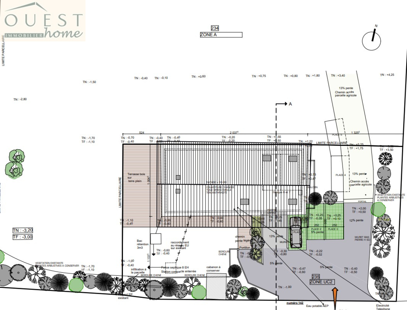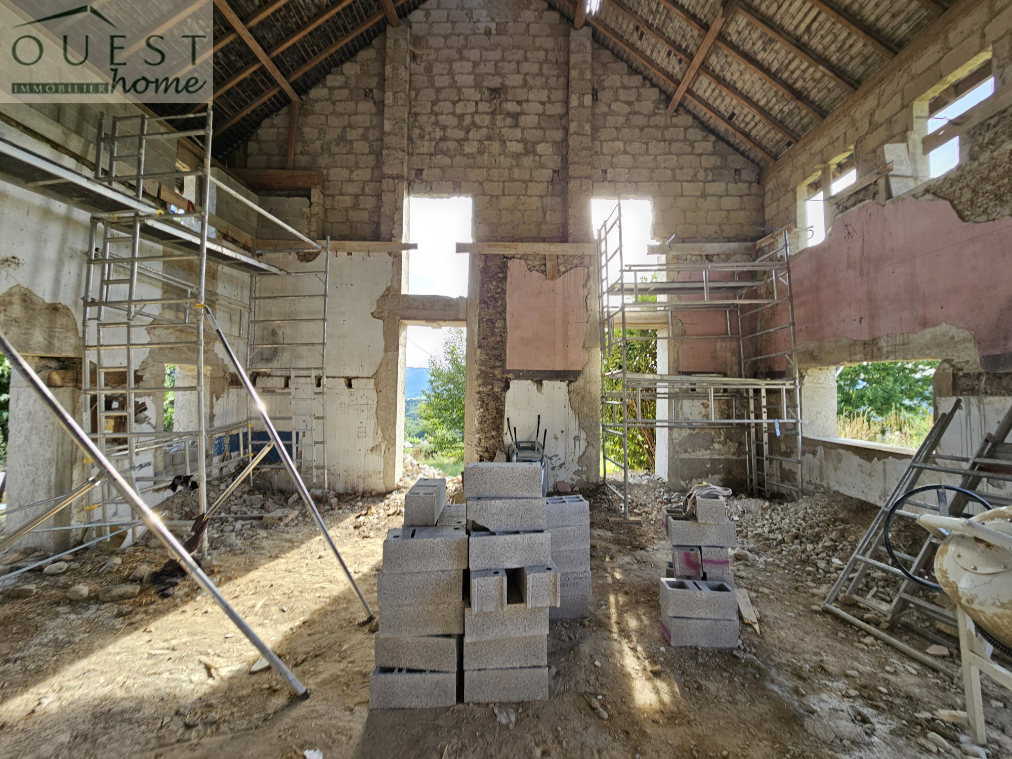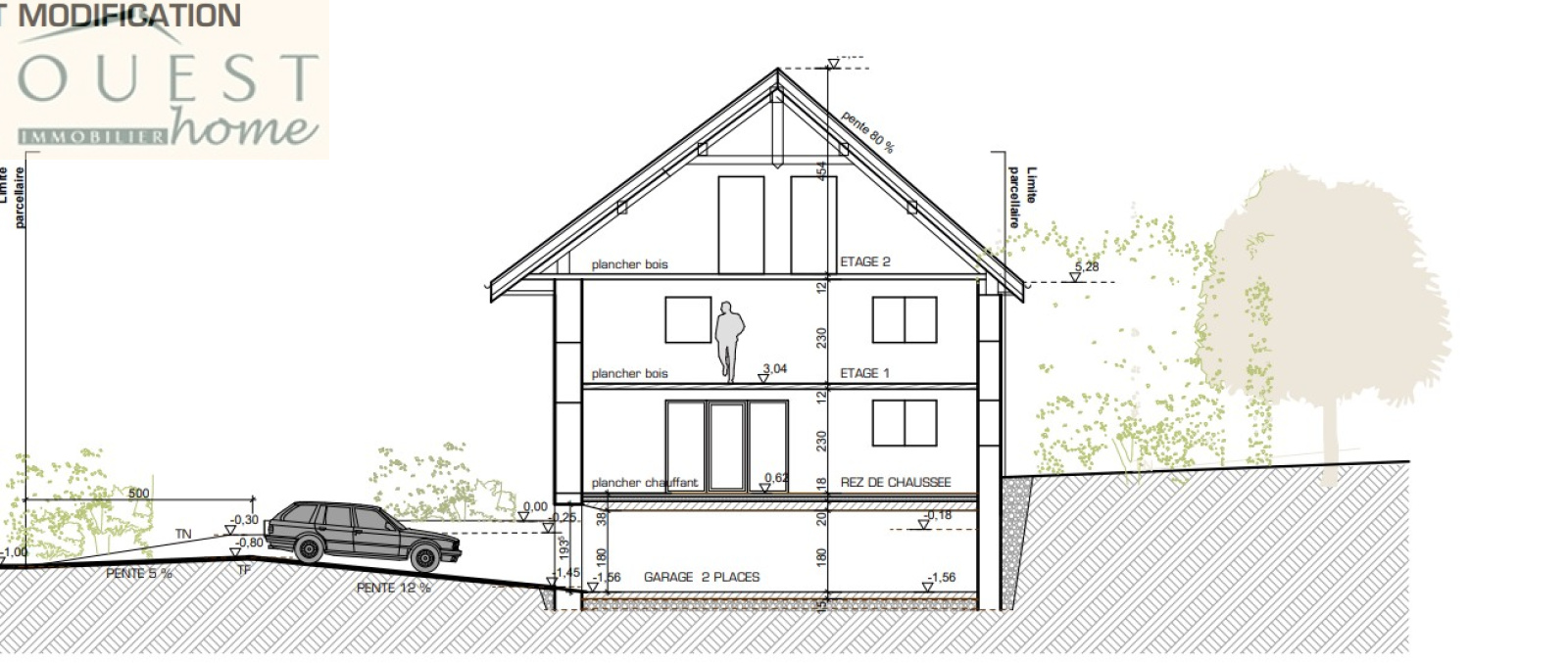 Dans le cadre du permis, l'intérieur n'est pas arrêté sur plans définitifs : l'ensemble est pensé comme un aménagement très ouvert, évolutif et adaptable au bâti existant. (A titre indicatif, ce dernier peut vous être communiqué.) Les menuiseries sont en gris anthracite, volets roulants intérieurs de même ton, et couverture de toiture en terre plate anthracite. Est également prévue la construction d'une terrasse d'agrément attenante au jardin et d'un accès véhicule en sous-sol avec une rampe d'accès discrète sur la façade principale.