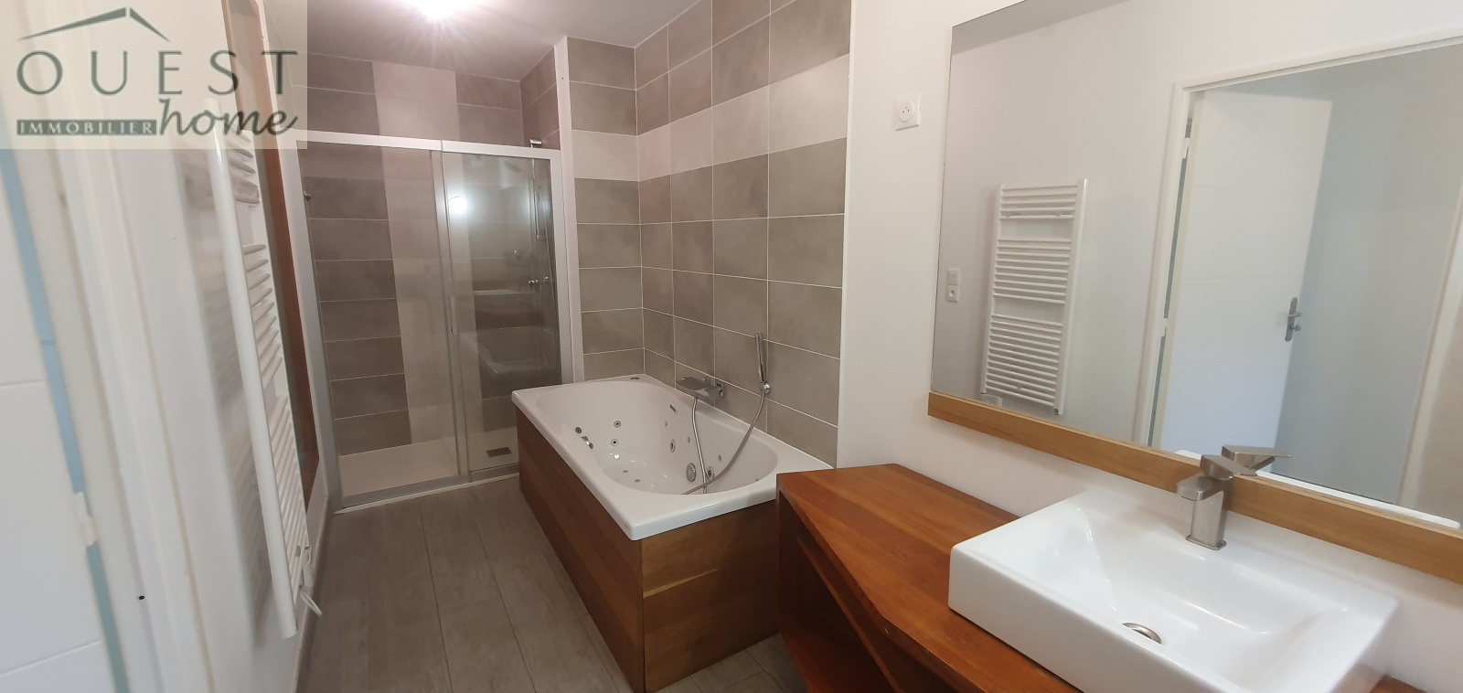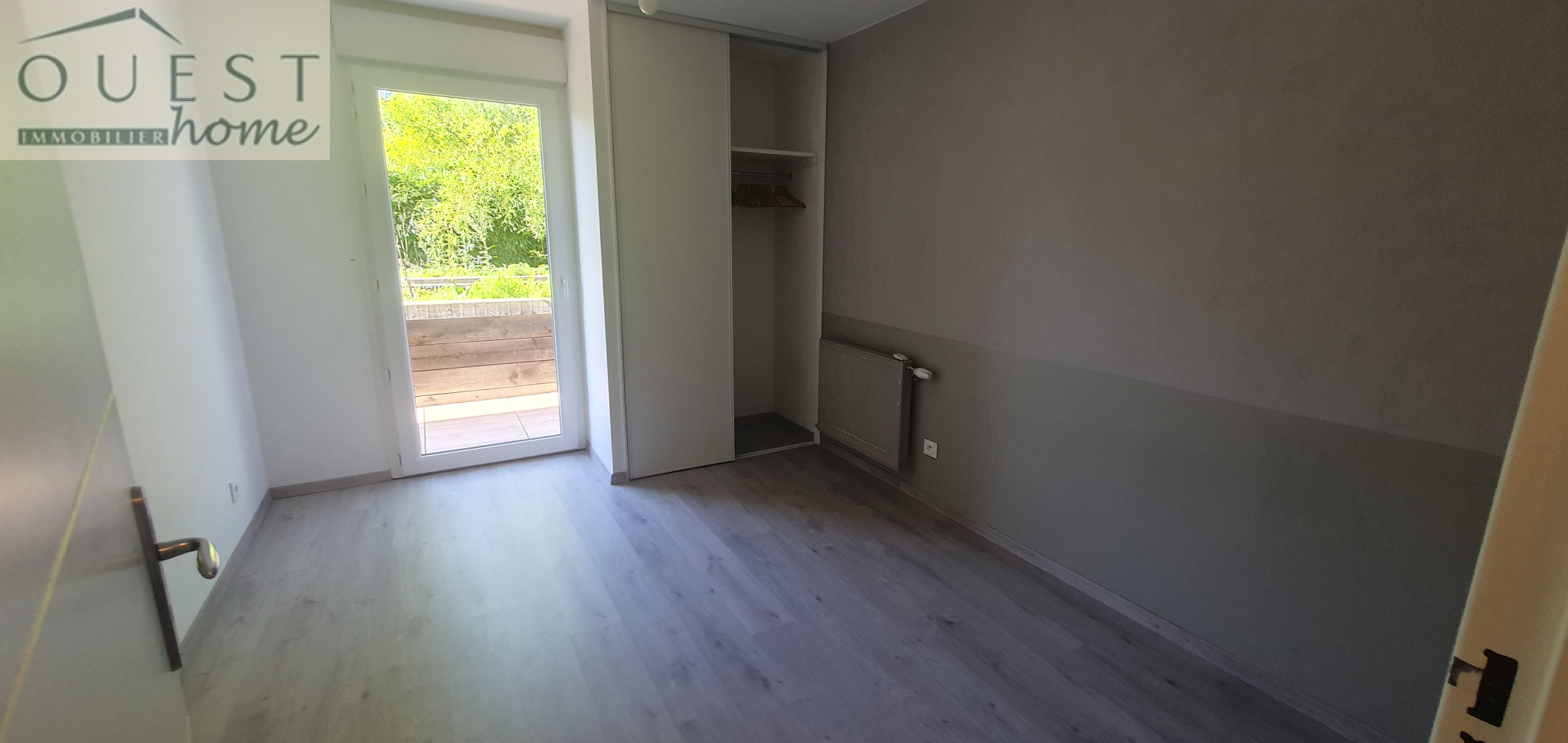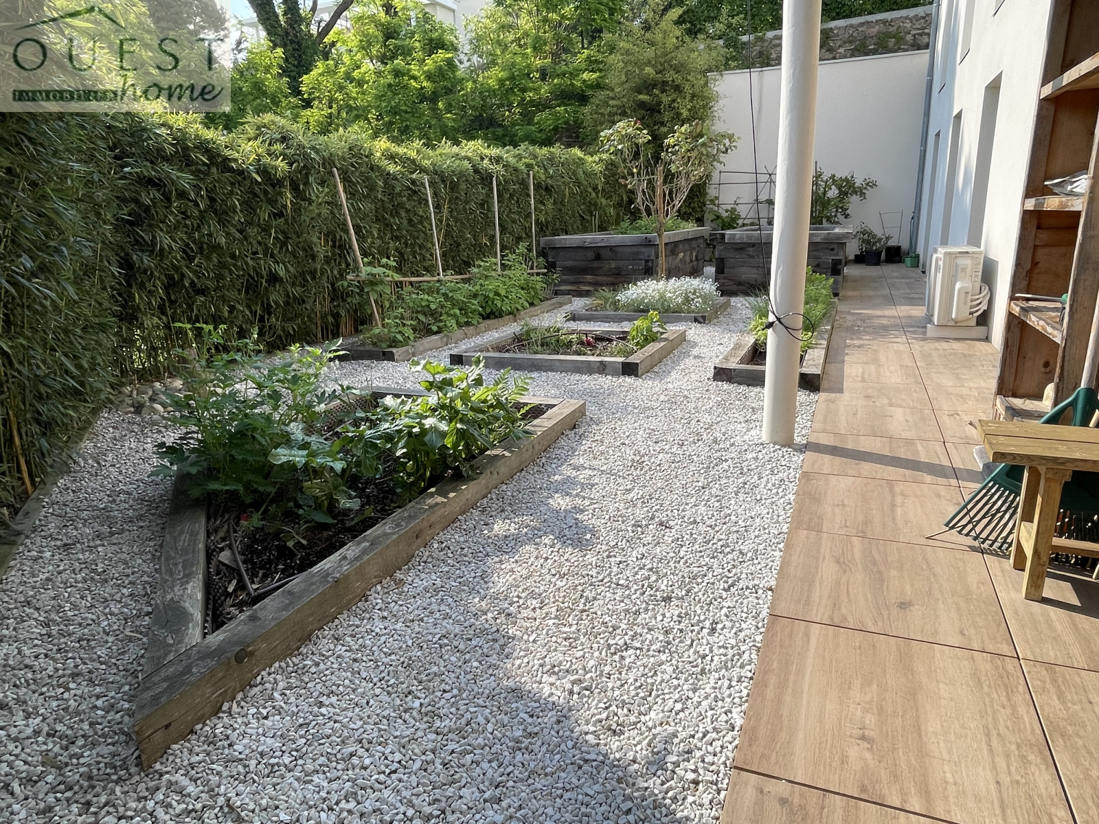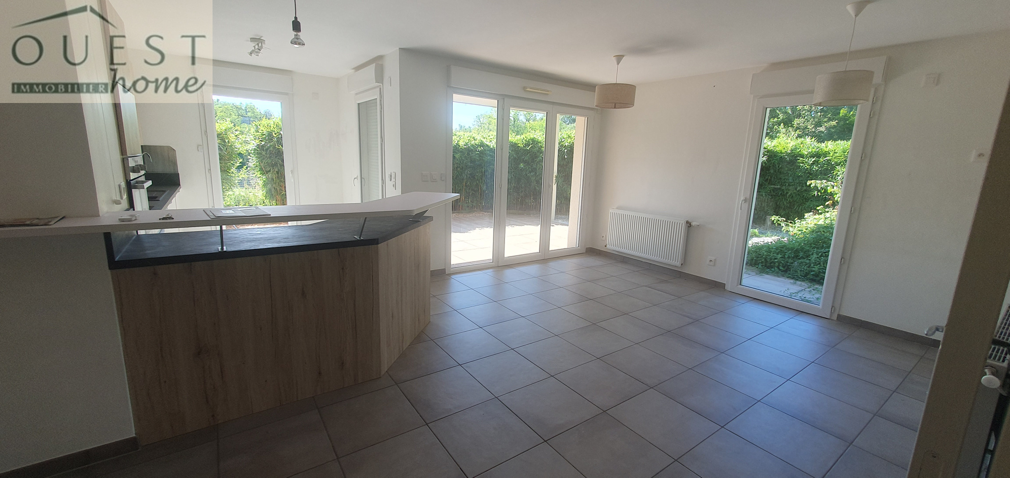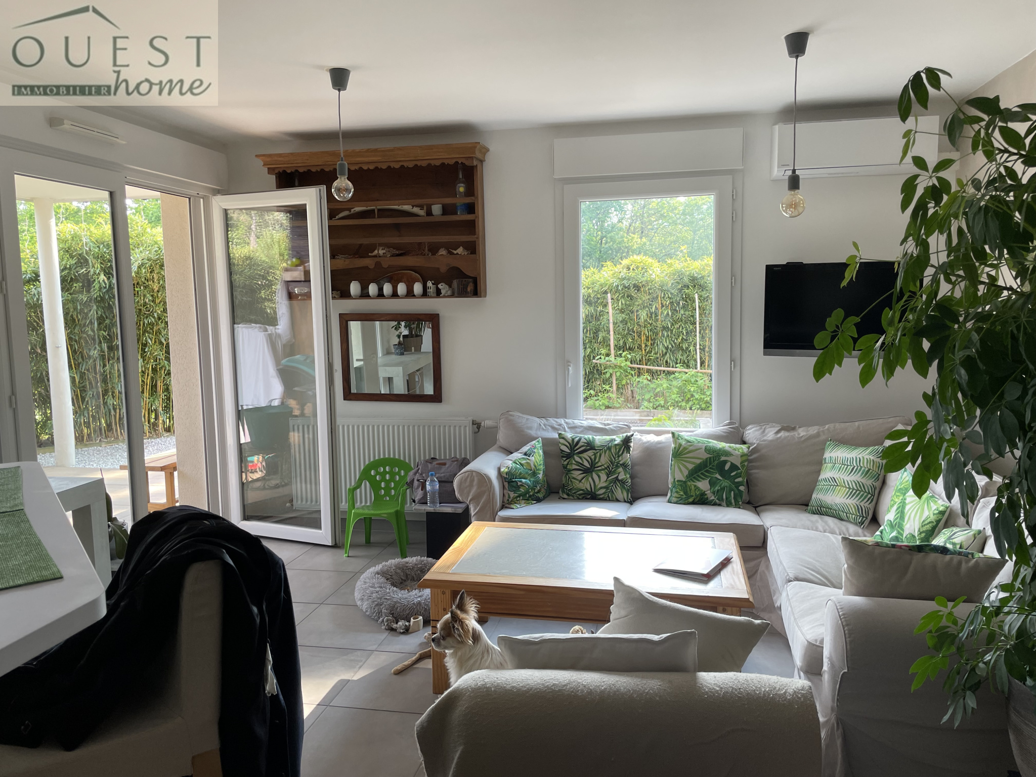 Une entrée dessert une belle pièce de vie, une cuisine américaine équipée avec accès à la terrasse de 30m² et au jardin de 118m² exposé SUD/OUEST.